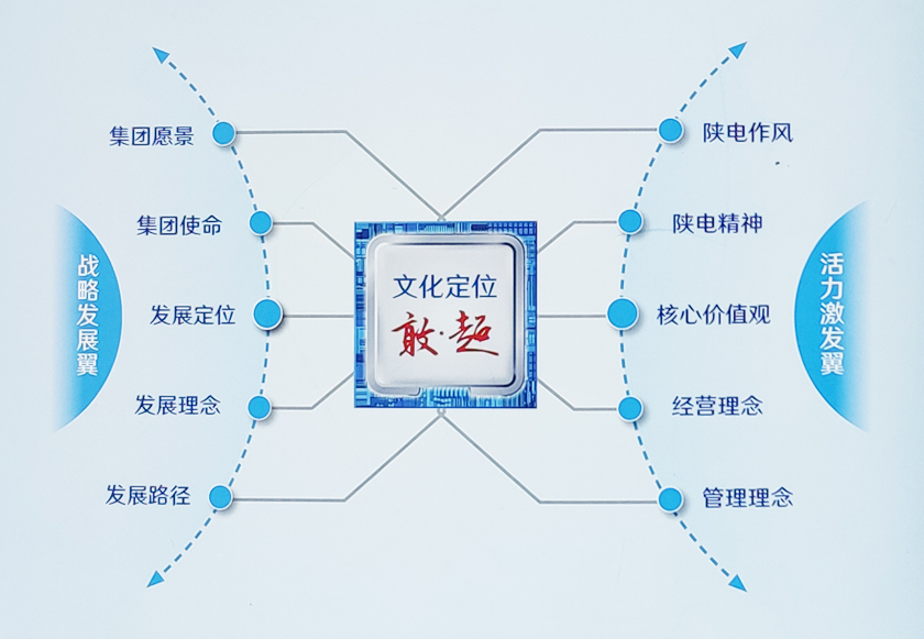 陕西电子理念文化系统由三部分构成,即企业文化定位、战略发展五大理念与活力激发五大理念。其中,以企业文化定位为统领,以战略发展与活力激发为两翼,明晰了陕西电子迈向卓越的“敢.超”之道。